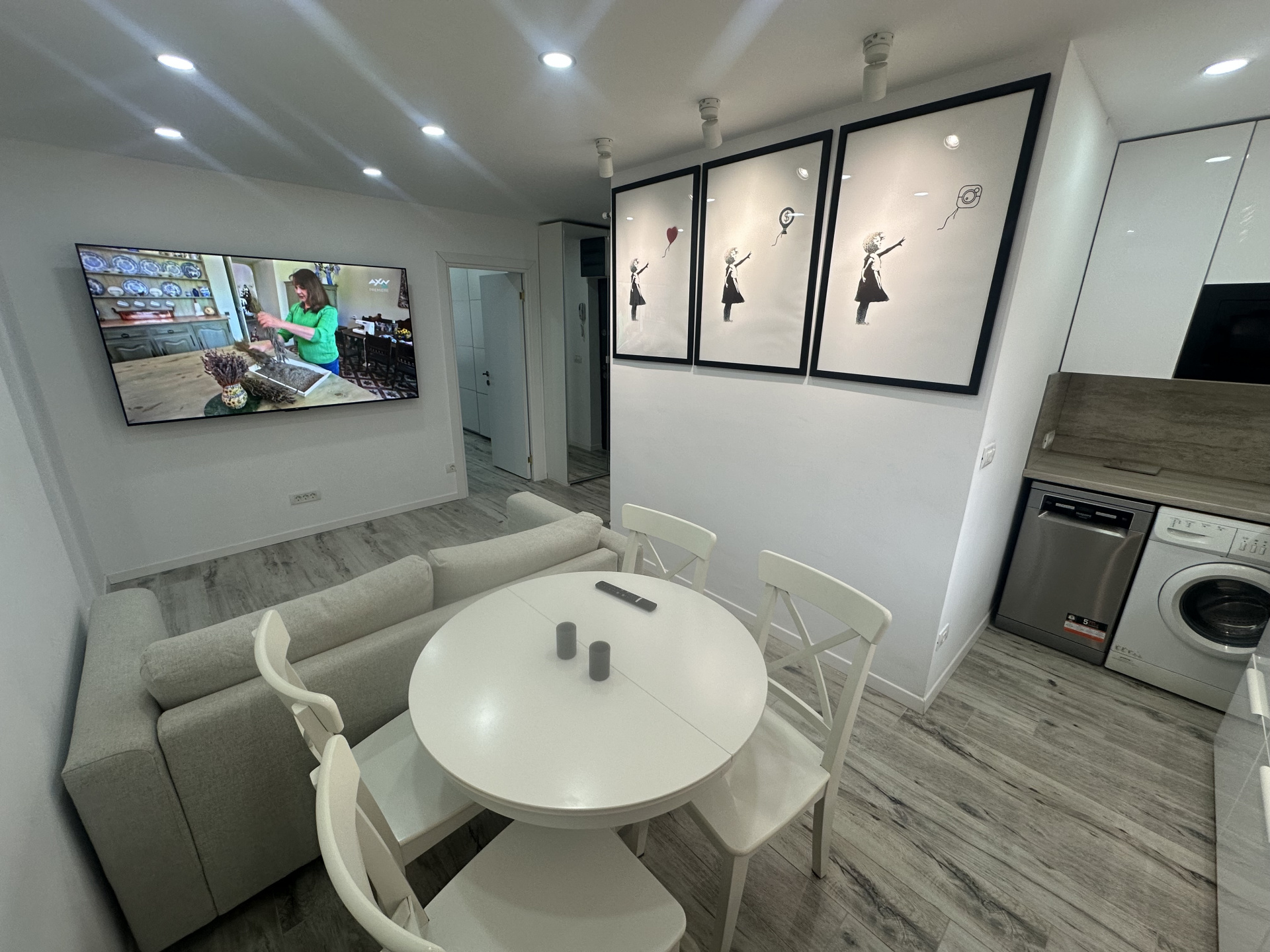 ✔️ Spațiul dintre bucătărie și hol a fost inteligent reconfigurat într-un living generos, cu canapea și TV