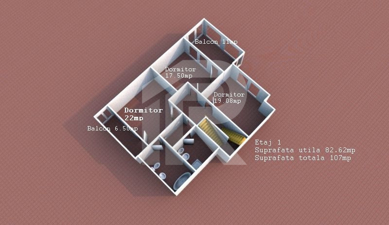 Etaj: 3 dormitoare (23mp 18mp 16mp) 2 bai (11mp 8mp) 2 balcoane (10mp 65mp)